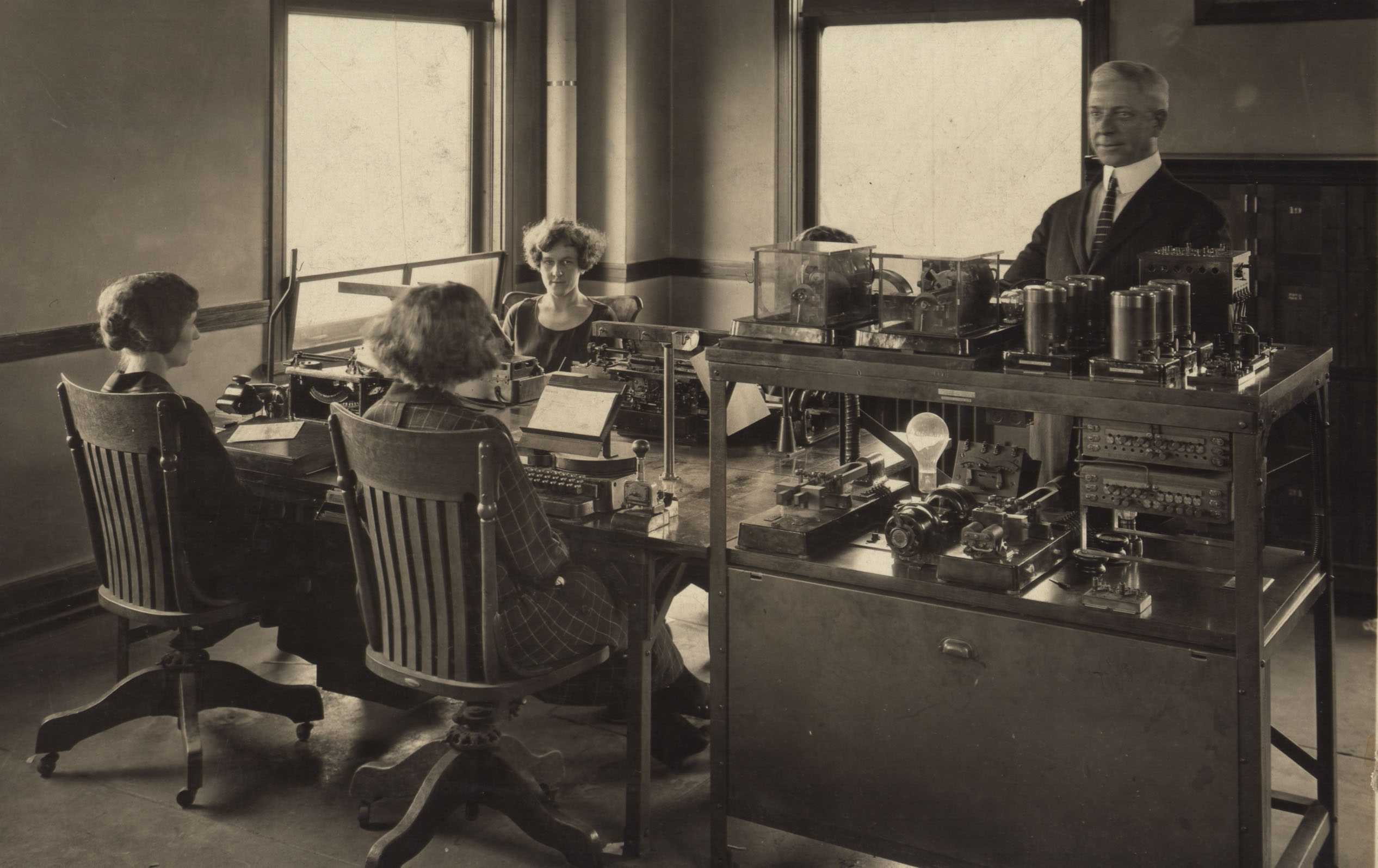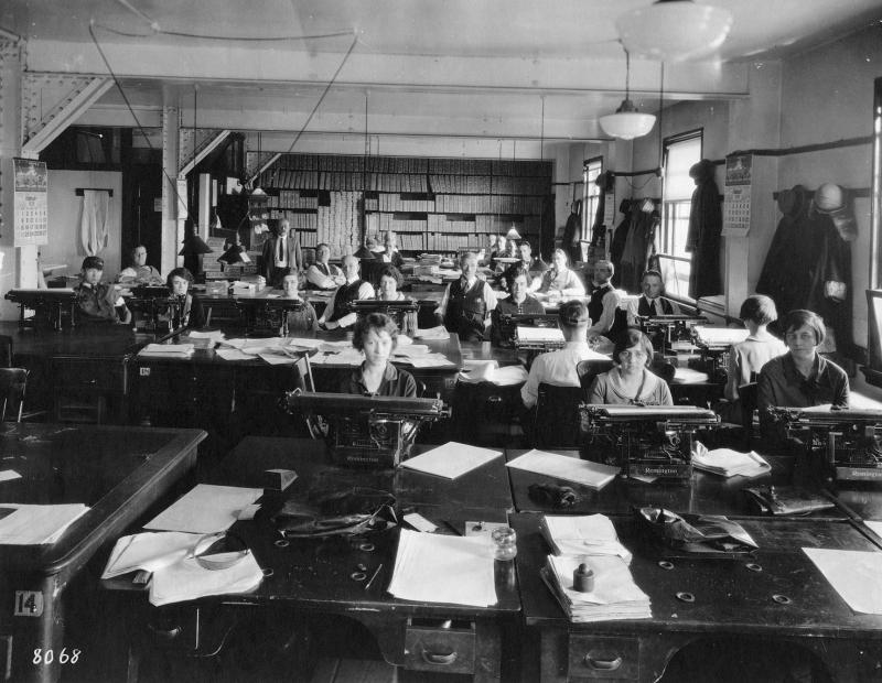 Interior, Bureau of Engraving, Minneapolis, MN, 1925. Stenographers are transcribing using dictating machines and typewriters. | Minnesota Historical Society, Neg. No. 17217. |