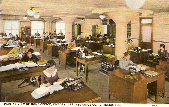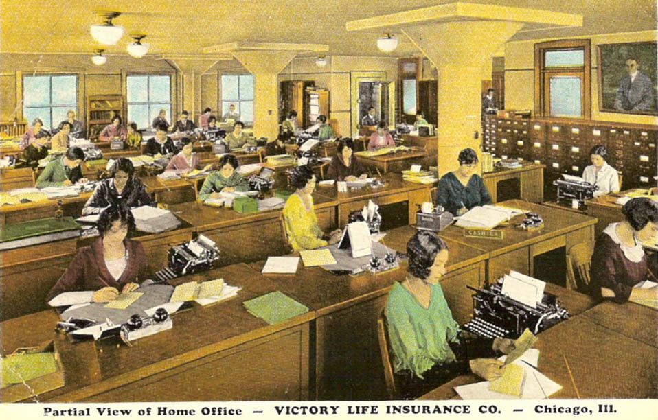 | "Partial View of Home Office, Victory Life Insurance Co., Chicago, Ill.," postcard. Reverse of top postcard states, "Began operating March 3, 1924. Operating in twelve states with sixteen branch offices. Employs more than five hundred persons." Reverse of bottom postcard says the same, except that "more than five hundred" is increased to "more than six hundred." The two views are nearly identical, except that there are more people working at more desks in the latter postcard image. According to the Chicago Historical Society, "Beginning in the teens and continuing through the 1920s, African American entrepreneurs [in Chicago], denied access to the city's main business district, built a thriving business center of their own in the vicinity of Thirty-fifth and State Streets. This self-contained community included several new buildings constructed with black capital, like the Overton Hygienic/Douglass National Bank Building. Erected in 1922-23, the building housed several business enterprises owned by Anthony Overton [1865-1946], including the Overton Hygienic Company, which specialized in black cosmetics, the Douglass National Bank, and the Victory Life Insurance Company." | Early Office Museum Archives  |