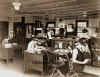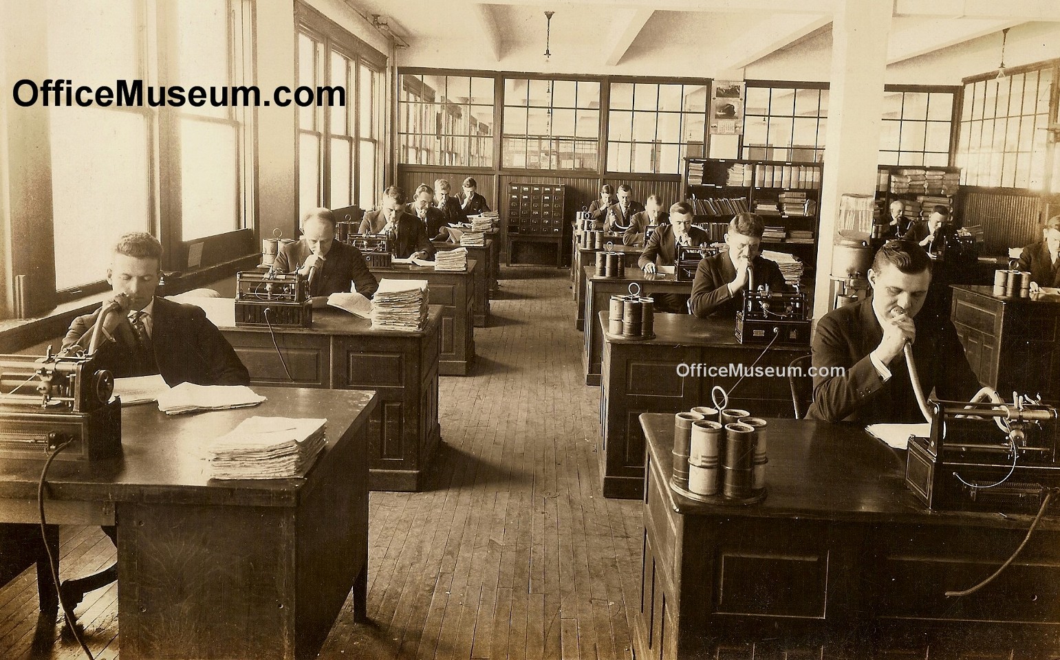 | Office, Home Office Building, Massachusetts Mutual Life Insurance Co., Springfield, MA. The candlestick telephones and the center part in the hair of the man front center suggest that this photo was taken in the 1920s. | Early Office Museum Archives  |