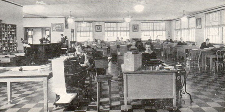 | General Office Building, Norwalk & Western Railway, Roanoke, VA. Wide carriage Remington typewriters or bookkeeping machines. | Virginia Tech ImageBase, Norfolk & Western Hist. Photo. Coll., No. ns5505. | |