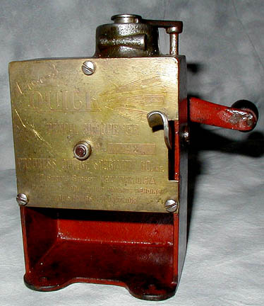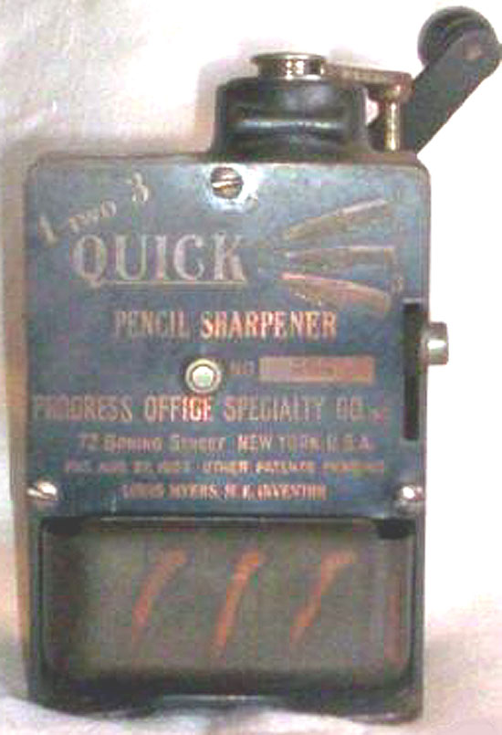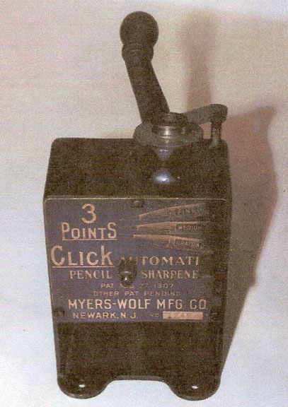 (a.k.a. Click Automatic Pencil Sharpener) Patented 1907 ~ Advertised 1910 (Click) Myers-Wolf Mfg. Co, Newark, NJ (Click) Shavings receptacles not shown Quick: Collection of the Thomas A. Russo Museum Click: Photograph courtesy of Howard Levin The cutting mechanism is a rotating multi-blade cutter, which advances toward the pencil and then clicks back when the sharpening is complete.