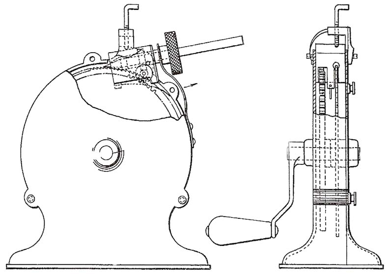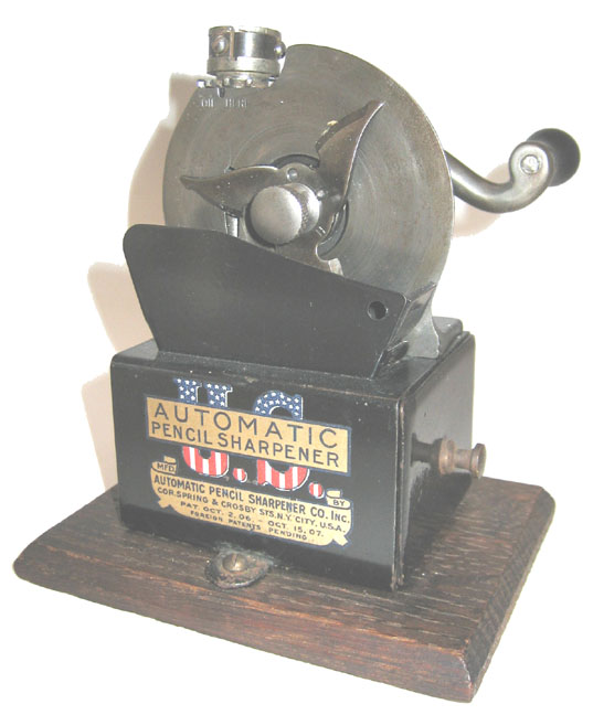 Automatic Pencil Sharpener Patented 1906-08 ~ Advertised 1907-26 Automatic Pencil Sharpener Co. (APSCO) New York, NY, then Chicago, IL There are two basic models, which are the same except that the later one has an oil cup (see upright located to the right of the chuck in the photos to right). While most have a decal like the one in the top photo to the right, some have different decals and various metal nameplates. A number of variants were marketed, including a model with a leather covering (lower right) and a model with a sterling silver body. |