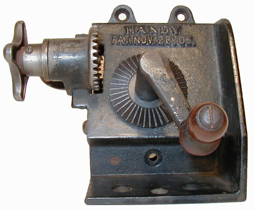 Pencil Sharpener Patented 1905 ~ Advertised 1907-09 A. A. Weeks Mfg. Co. New York, NY Shown without shavings drawer. The genuine machine pictured here has the name Handy and the patent date embossed in the casting. A machine that does not was presumably produced by another company after the patent expired.. |