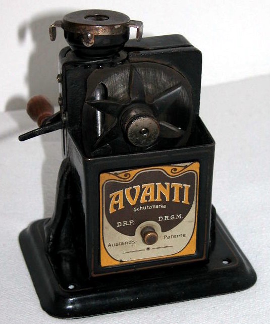 Pencil Sharpener Patented 1909 & 1917 (Germany), 1910 & 1912 (UK), 1913-1915 & 1926 (US) ~ Advertised 1914-39 with variations (Germany) Avanti Dresden, Germany The 1909 (Germany), 1910 & 1912 (UK), and 1913 (US) patents are the same as those for the Right Pencil Sharpener, which had the same inventor. Many machines with this cutting system were produced in Germany and elsewhere on the European continent in the 1920s-1960s. The two Avanti pencil sharpeners to the right have different labels. |