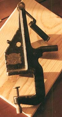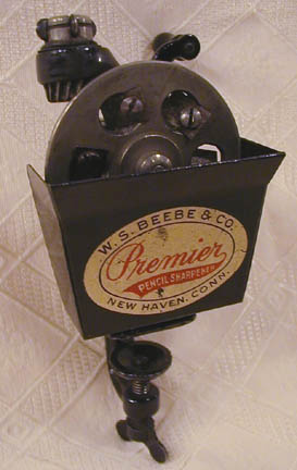 | Premier Pencil Sharpener (a.k.a. Knife Blade Automatic) Patented 1910 ~ Advertised 1913 (Knife Blade) W. S. Beebe & Co., New Haven, CT. (Premier) National Specialty Sales Co., New Haven, CT (Knife Blade) We have found no advertisement for the Premier. However, we have found one advertisement for a Knife Blade Automatic (System, Sept. 1913.) The Knife Blade pictured in the ad is identical to the Premier except that at the bottom instead of a clamp there is a base that stands on a desk. The ad states: "Where it is desired to have it portable, an enamelled stand is provided for fifty cents additional." Without the stand, the Knife Blade was $3. |