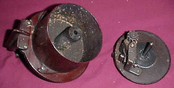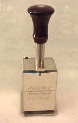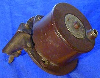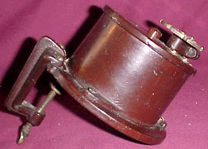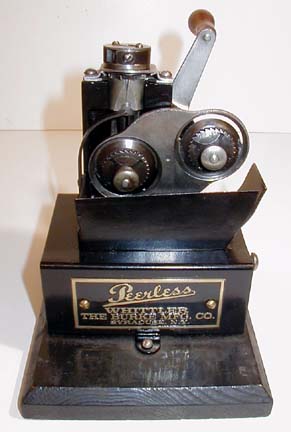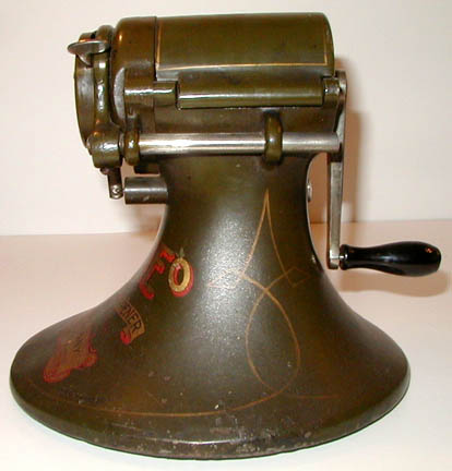 Pencil Sharpener Patented 1915 ~ Advertised 1914-15 J. K. Stewart Mfg. Co., Chicago, IL 1915 Price $2 The 1915 model in the photo to the right has an adapter that can be positioned in front of the aperture for use in sharpening thin pencils. The machine was marketed in 1914 without this adapter. |