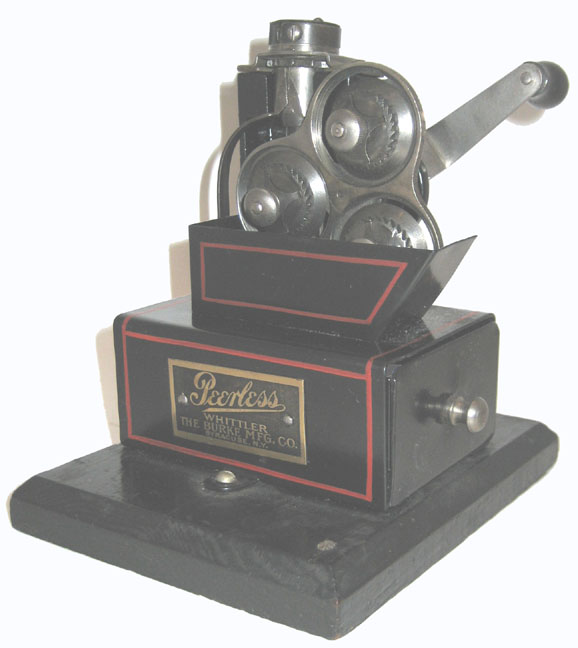 (three blades) Patented 1910 (Germany & UK, by Peerless Whittler Co. of New York) ~ Advertised 1911-13 The Burke Mfg. Co., Syracuse, NY (1911) W. M. Welch Mfg. Co., Chicago, IL (1912-13) |