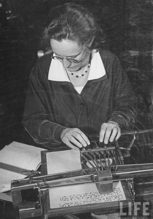 Left:  Typist using Braille typewriter, London, England,